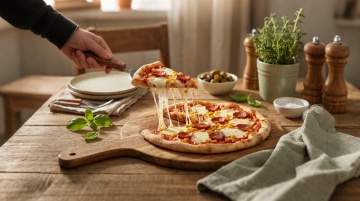 超写实美食摄影风格,特写镜头下的双层芝士培根汉堡,顶部是撒有黑芝麻的金黄色芝麻面包,面包边缘微焦,夹着两片厚实多汁的煎制牛肉饼,肉饼表面有诱人的焦香纹理,融化的黄色芝士从肉饼边缘溢出,上层覆盖几片酥脆的深红色培根,培根边缘微卷,中间夹着紫红色洋葱圈,下层铺着新鲜翠绿的生菜叶和几片鲜红的厚切番茄片,底部是同样的芝麻面包,整个汉堡放置在棕色烘焙纸上,纸张铺在深色木质圆形托盘上,托盘边缘可见自然木纹,汉堡左侧有一把银色金属叉子和刀子交叉摆放,背景略微虚化,左侧后方有一个金属容器,里面装满金黄色的炸薯条,薯条表面撒有细盐,容器内衬浅色油纸,右上角有一个棕色纸质包装袋,整体画面采用侧上方单光源,光线柔和,在汉堡上形成明显的高光和阴影对比,突出食材的质感和立体感,色调温暖,以棕色、金黄色、红色为主,营造出浓郁诱人的美式快餐氛围,背景为深色,突出主体食物,无文字和二维码。