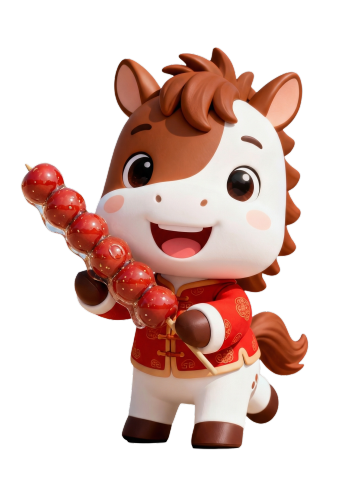 软3D风拟人小马,身穿国潮红衣,手持糖葫芦,萌趣十足,洋溢喜庆年味。