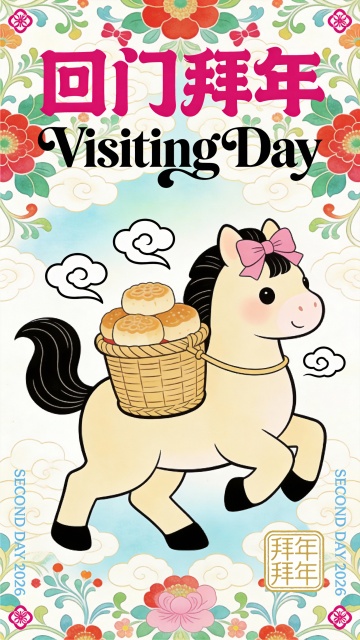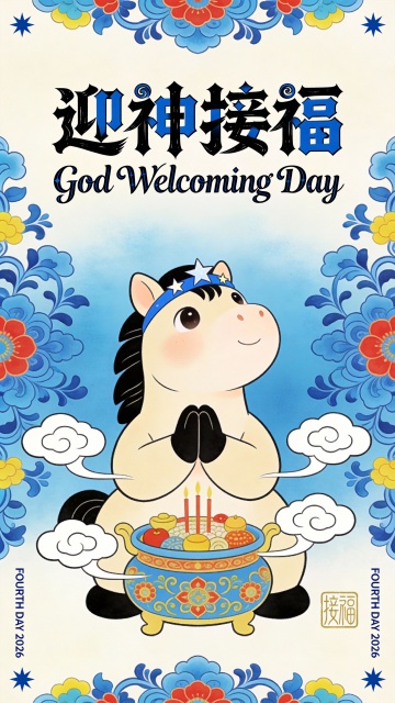 画面顶部横向排列书法笔触 + 几何切割艺术字体的明黄色中文 “新春纳福”,字体笔画末端做圆润卷曲处理,下方配缠绕式艺术花体英文 “Blessing Day”,英文字母与中文笔画交织,构成视觉主标题;画面底部两侧各竖排一列微小的浅粉色无衬线英文 “NEW YEAR'S DAY 2026”,视觉中心右下角盖一枚极简线条的浅金色 “纳福” 印章。画面核心主体是昂首挺胸、前蹄微微抬起的奶咖色 Q 版卡通小马,它戴着金色铃铛项圈,嘴里叼着写有 “吉” 字的红色丝带,面前摆放着打开的金色礼盒;礼盒周围环绕 3 个扁平化白色线条祥云,画面四角各点缀 1 个迷你红色灯笼符号。背景是浅粉到淡橙的柔和渐变,整体采用对称式居中布局,上下留白突出新春喜庆场景。