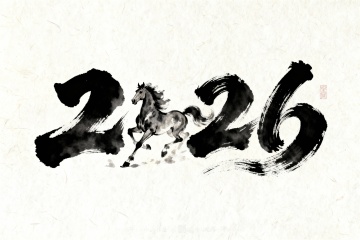 水墨风骏马奔腾,红底衬托国潮气息,大字“2026”融合工笔与书法,中式复古喜庆感十足。