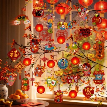 红白剪纸风设计,融合福字、灯笼、舞狮、鱼等中式元素,喜庆浓郁,民族气息浓厚,采用单色剪影与超级符号手法,皮影风格点缀,传递春节祥瑞氛围。