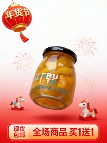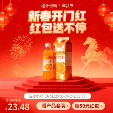 3D轻拟物风格,塑料质感橙汁瓶悬浮于红白渐变背景,搭配年货节灯笼与烟花,营造喜庆促销氛围,底部醒目标注“买1送1”优惠信息。
