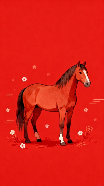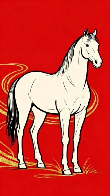 喜庆红底衬托白色骏马,描边线条勾勒出流畅轮廓,鎏金纹饰点缀其间,融合国潮风与中式美学,插画风格尽显祥瑞之气。
