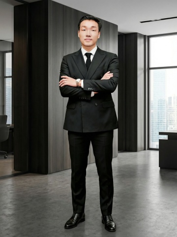 商务感十足的实景肖像,采用性冷淡风与单色设计,金属质感光影强化立体层次,呈现专业沉稳的视觉氛围。