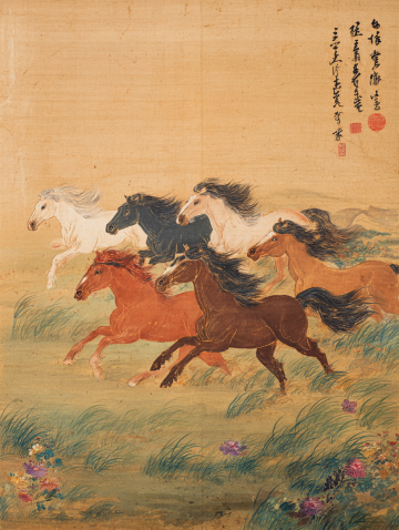 水墨风与鎏金风交融,工笔勾勒骏马腾跃之势,古典山水背景衬托出中式唯美感与热血励志气息,尽显优雅文艺之韵。