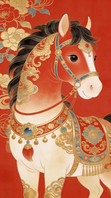 工笔风骏马,融国潮与鎏金元素,刺绣纹样华丽,浮雕质感凸显古典奢华,红金配色尽显喜庆祥瑞。