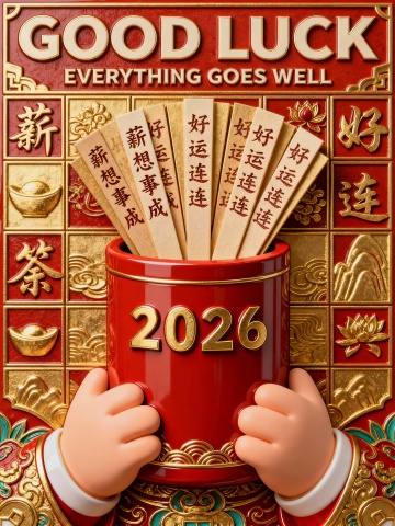 中式喜庆风,3D拟人手捧金签罐,鎏金浮雕纹样,卡通感十足,寓意2026好运连连,吉祥如意。