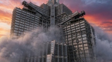 商务感与科技感交织的现代办公室,3D风微缩艺术呈现视错觉,巨像人物立于实景空间,塑料质感强化未来感。