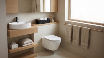 极简主义风格的卫生间室内设计,整体采用米白色与浅木色的柔和配色方案,温暖的嵌入式灯带与顶部筒灯提供均匀柔和的照明,营造明亮通透的氛围。墙面和地面铺设大块浅色哑光瓷砖,线条简洁流畅。不同场景下的卫生间摆设:有的配备悬挂式白色洗手台,台面整洁,搭配简约白色水龙头,上方是带储物功能的镜柜,旁边装有黑色金属毛巾架;有的设置独立玻璃淋浴房,内部有壁龛收纳洗浴用品,黑色淋浴喷头与五金件形成精致对比;有的墙面悬挂线条简约的黑白花卉装饰画,下方嵌入木质灯带壁龛,摆放香薰和装饰摆件;有的空间内放置智能马桶,旁边设有带木质搁板的收纳区。整体设计注重功能性与美学的平衡,空间布局合理,细节处理精致,呈现出现代、干净、舒适的卫生间环境。