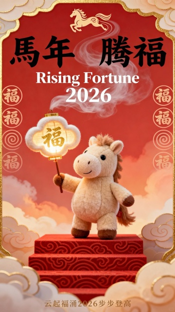 国潮风软3D卡通马手持鎏金福灯,云纹边框环绕,毛发生长质感细腻,红金配色喜庆祥瑞,寓意马年腾福、步步登高。