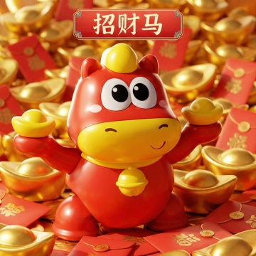 软3D风萌马手办,融合国潮与鎏金元素,喜庆红金配色,卡通可爱造型,手持金元宝,寓意“马上有财”,2026马年贺岁佳作。