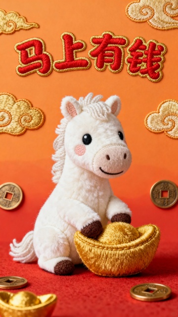 刺绣风与国潮元素结合,萌趣小马坐拥金元宝,喜庆红橙背景衬托卡通感十足的中式吉祥画面,传递“马上有钱”的节日祝福。