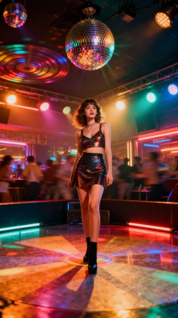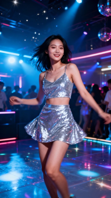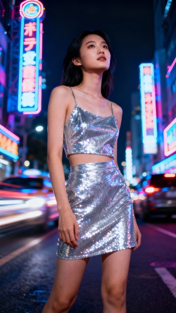 赛博朋克风舞台,Y2K未来感造型,霓虹灯辉映下的虚拟现实摇滚少女,金属与塑料质感碰撞,光影流动,酷炫梦幻。