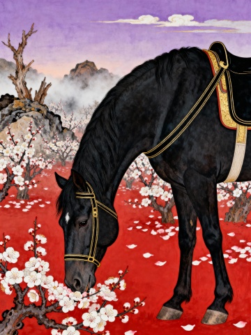 工笔浮雕风红马,鎏金鬃毛飘逸,刺绣纹饰华美,金属质感厚重,尽显中式古典奢华与民族复古气韵。