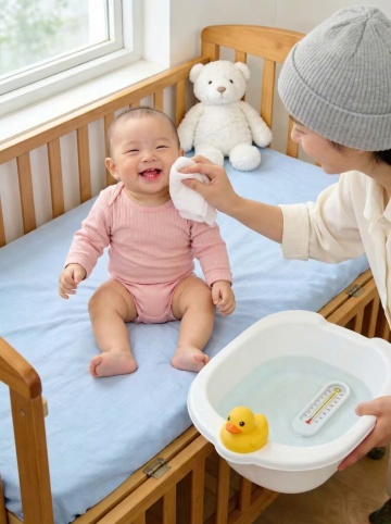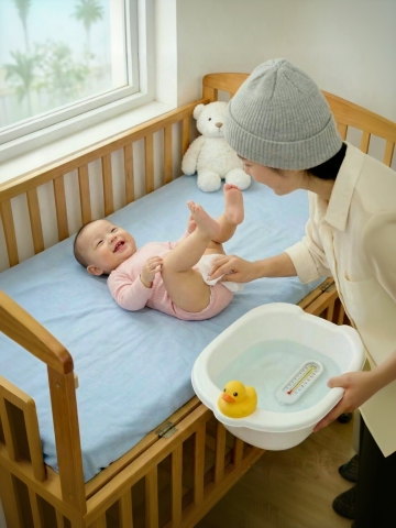 温暖光影中,婴儿裹着质朴针织毯,被双手轻托,柔和色调与自然纹理交织,传递出静谧温馨的初生之爱。