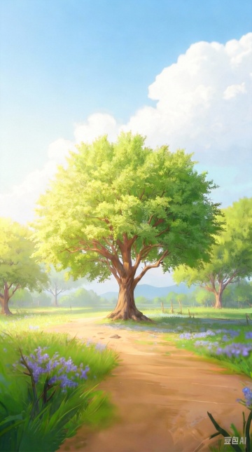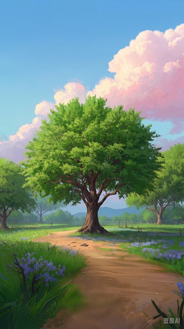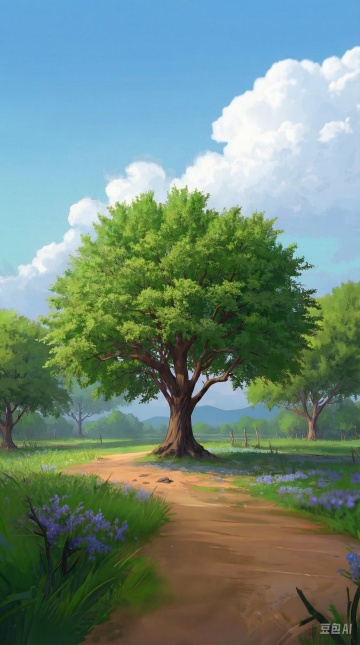 清新水彩插画风,舒适田园景致,绿树成荫,小径通幽,尽显自然之美。