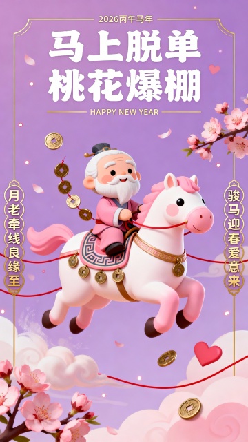 粉紫柔雾、桃花枝与红丝线交融,搭配萌马粉白、铜钱鎏金,营造出甜美浪漫又喜庆吉祥的氛围,尽显马年脱单祈福的治愈感与幸福感。