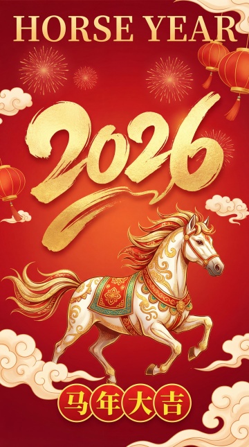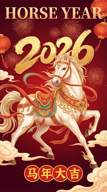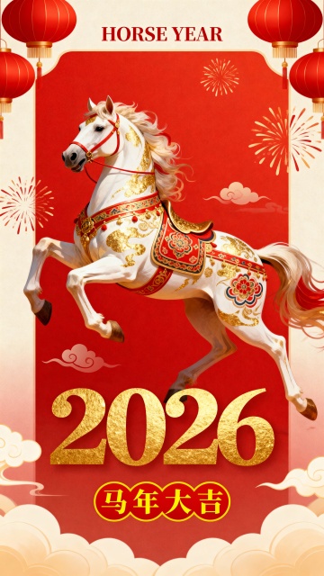 鎏金浮雕骏马跃动,中式古典山水卷轴铺陈,3D重拟物风呈现喜庆奢华,金属质感闪耀2026马年吉祥。
