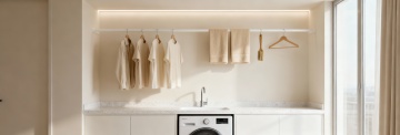 极简主义风格的卫生间室内设计,整体采用米白色与浅木色的柔和配色方案,温暖的嵌入式灯带与顶部筒灯提供均匀柔和的照明,营造明亮通透的氛围。墙面和地面铺设大块浅色哑光瓷砖,线条简洁流畅。不同场景下的卫生间摆设:有的配备悬挂式白色洗手台,台面整洁,搭配简约白色水龙头,上方是带储物功能的镜柜,旁边装有黑色金属毛巾架;有的设置独立玻璃淋浴房,内部有壁龛收纳洗浴用品,黑色淋浴喷头与五金件形成精致对比;有的墙面悬挂线条简约的黑白花卉装饰画,下方嵌入木质灯带壁龛,摆放香薰和装饰摆件;有的空间内放置智能马桶,旁边设有带木质搁板的收纳区。整体设计注重功能性与美学的平衡,空间布局合理,细节处理精致,呈现出现代、干净、舒适的卫生间环境。