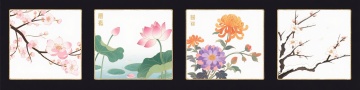 中国传统工笔淡彩风格,古香古色,纯色背景,四幅植物素材集合规整排布。每幅均采用细腻流畅的线条勾勒轮廓,辅以淡雅透明的水彩晕染技法,呈现柔和的光影过渡和温润的质感。第一幅为红梅,虬曲枝干上点缀着胭脂红的梅花,花蕊呈鹅黄;第二幅是幽兰,嫩绿兰草舒展,淡紫色花瓣雅致,叶片有细微的墨色晕染;第三幅为翠竹,挺拔竹节以墨色勾勒,竹叶呈青翠渐变色,疏密有致;第四幅乃黄菊,金黄花瓣层层叠叠,墨色枝干旁有浅赭石色枯叶点缀。整体色彩和谐统一,保持工笔画的雅致韵味与细腻笔触,画面简洁明快,信息传达清晰,具有传统文人画的审美意趣。