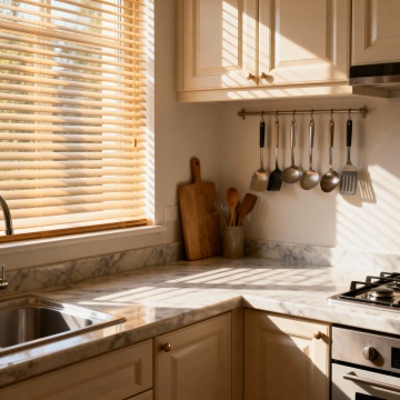 一个明亮整洁的现代厨房,采用简约优雅的设计风格,以白色为主色调,搭配黄铜色金属装饰细节。厨房整体呈现出温馨舒适的氛围,阳光透过百叶窗洒入,在白色橱柜和大理石台面上形成柔和的光影效果。白色的橱柜带有黄铜色的圆形拉手,上方的吊柜和下方的地柜组合提供了充足的储物空间。大理石台面光滑洁净,带有自然的灰色纹理。台面上有一个双槽不锈钢水槽,搭配黄铜色的水龙头。水槽旁边的金属桶里插着木质的锅铲和汤勺。墙面安装着黄铜色的挂杆,上面挂着各种木质和金属材质的厨房用具,包括勺子、铲子等。挂杆上方的白色搁板上摆放着不锈钢和玻璃材质的储物罐,里面装着各种香料和食材。台面上还摆放着一个白色的盘子,里面放着几块叠在一起的三明治,旁边还有一盘色彩鲜艳的沙拉。整体构图采用了三分法,光线从左侧窗户进入,营造出明亮通透的感觉,细节丰富,质感细腻,展现出干净利落的现代厨房设计感。