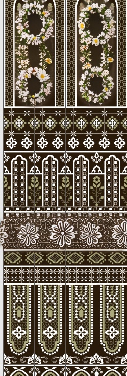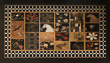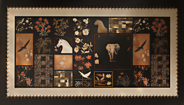 一组12个具有浓郁传统民族风格的圆形和方形刺绣纹样,采用蓝绿色、橙色和米白色为主色调,以黑色为纯色背景,纹样包含花卉、几何线条和卷曲装饰等元素,每个纹样均有独特的对称图案设计,整体以3行4列的规整网格排布,呈现出精致细腻的刺绣质感和复古华丽的视觉效果,适合作为传统服饰、家居装饰或文创产品的图案素材集合。