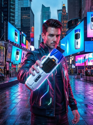一个帅气男人 人物清晰 产品清晰 参考图 单手拿产品对着镜头 图片尺寸为1500*2000