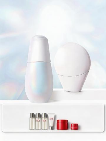 超写实电商产品图,被形态各异的透明水珠、水簇环绕,部分水珠附着产品表面。背景为低饱和渐变底色,冷调光源从侧下方照射,凸显产品科技感与成分专业性。材质表现哑光细腻,色彩搭配以主体色彩为主,色调柔和高级,构图采用轻微倾斜角度,动态元素环绕主体,含品牌 logo