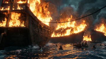 这是三国演义中赤壁之战的场景,去掉画面内所有文字,将二维画面内的所有内容转化成为高清,细腻的三维效果,要保持画面的原有构图,UE5级别画质,4k画质,16;9比例