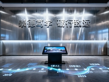 实文化一小校史展厅 序厅:时光之门・精神序章​ 核心视觉​ 主形象墙,镌刻校训 “崇德笃学 砺行致远”,下方嵌入地面投影时间轴,流动呈现建校以来关键年份。中央设置全息投影装置,循环播放由师生共同拍摄的校史短片《薪火》,搭配校歌旋律营造沉浸式氛围。 ​ 前言、​互动节点 第一展区:拓荒岁月・弦歌不辍(19XX-19XX)​ 板块主题 从初创到奠基,在艰辛中扎根生长​ ​互动设计 触摸查询屏内置 “校史时间轴”,点击年份可查看对应时期的历史照片、新闻报道与口述回忆。​ 第二展区:成长蜕变・薪火相传(19XX-20XX)​ 板块主题 从规范到优质,在改革中蓬勃发展​ 1. 校园变迁​ 2. 名师风采​​ 3. 教育革新​ 第三展区:桃李芬芳・弦歌永续(20XX - 至今)​ 板块主题 从优秀到卓越,在创新中书写华章​ 1. 教学硕果​​​,荣誉展示 2. 校友星光​​ 3. 文化浸润​ 互动设计 设置 “时光信箱”,参观者可写下对未来的期许投入信箱 第四展区:筑梦未来・再创辉煌​ 板块主题 从现在到未来,在传承中迈向新篇​ 1. 发展蓝图​​ 2. 精神接力​ ​ 尾厅:岁月回响・心语留痕​ 核心设计 墙面展示 “校友祝福” 照片集,中央设置留言台,提供纸笔供参观者留言。​ 结语 风格以现代风格为主,帮我出10张图