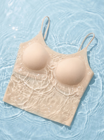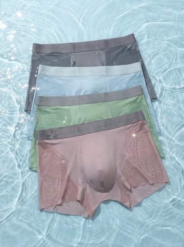 主体泡在波光粼粼、带有闪烁光点的淡蓝色水池里,以俯拍视角呈现,清新、水润的质感,采用写实的产品摄影风格。内裤需要平整顺滑,浸入在水中