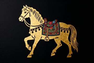 剪纸风与皮影风融合的中式插画,马身饰以民族纹样,复古色调,呈现传统节日喜庆氛围。