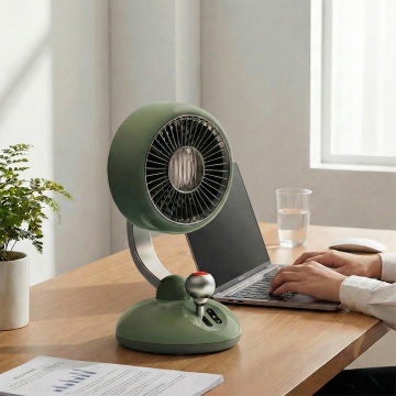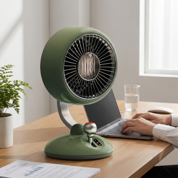 现代感简洁风设计,轻拟物风扇置于书桌,营造高效办公氛围。