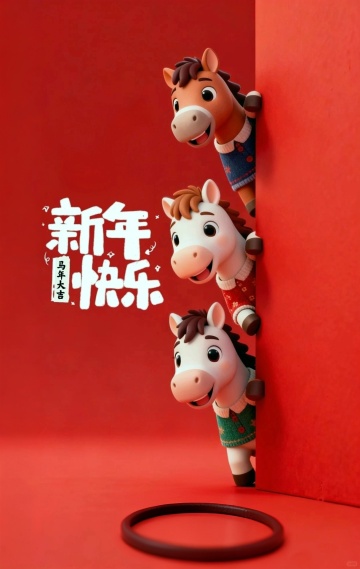 以喜庆的大红色为背景,采用黏土 3D 卡通风格,三只穿着不同颜色针织毛衣的可爱小马从右侧红色墙体后探出头来,表情活泼欢快。画面左侧有白色爱心形状的 “吉” 字,搭配白色毛笔字体的 “新年快乐 马年大吉”,底部标注 “2026 Happy New Year” 和 “马上有福 马到成功” 的祝福语,整体氛围充满新年的喜庆与萌趣感。比例9:16