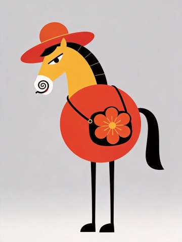 卡通感与拟人风结合,扁平化几何造型的马儿戴红帽、背花包,孟菲斯风格色彩碰撞,趣味十足,节日氛围轻松时尚。