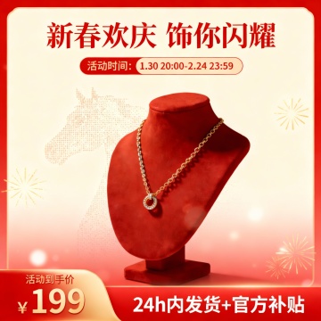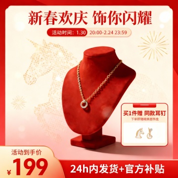 国潮风剪影马形由“福”字构成,鎏金铜钱与灯笼点缀,红金配色尽显中式奢华喜庆,金属质感唇膏凸显高端格调,节日氛围浓厚。