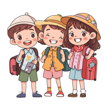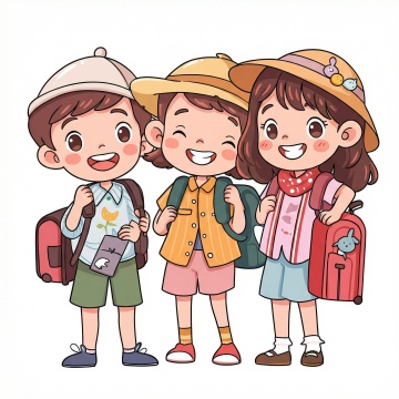 Q版可爱卡通风格儿童系列素材套系,六个圆胖脸型的儿童规整排列在白色背景上,每个孩子都有红扑扑的脸颊、水汪汪的大眼睛和灿烂的笑容,整体采用明亮鲜艳的色彩搭配,线条圆润流畅。第一个孩子是男孩,穿着黄色条纹上衣和绿色短裤,背着橙色书包;第二个孩子是女孩,梳着双马尾,穿着蓝色背带裙和粉色鞋子,张开双臂;第三个孩子是女孩,扎着两个黄色蝴蝶结,穿着黄色上衣和蓝色短裤,手持书本;第四个孩子是男孩,穿着红色运动服,正在跳绳;第五个孩子是女孩,穿着粉色连衣裙,手里拿着一朵花;第六个孩子是男孩,穿着蓝色T恤和灰色短裤,正在喝水。整体氛围活泼欢快,充满童真童趣。