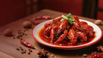 一碗盛满鲜红诱人小龙虾的白色瓷碗,小龙虾堆得满满当当,壳色红亮,肉质饱满,浸泡在橙红色的浓郁汤汁中,汤汁表面漂浮着翠绿的葱花和鲜红的辣椒段。一只小龙虾正从碗中跃起,姿态生动,溅起金色的汤汁飞沫与几颗花椒,旁边还有两颗八角也随之飞起。碗的周围散落着几颗完整的八角和鲜红的小辣椒,营造出热辣鲜香的氛围。背景变换为温馨雅致的木质餐桌,桌面上铺着浅灰色的餐布,散落着几片翠绿的香菜叶和几颗白芝麻,整体光线柔和温暖,突出小龙虾的诱人色泽和菜品的精致感,高清晰度,写实风格,色彩鲜明,构图饱满,富有食欲。