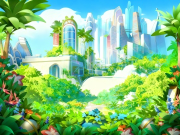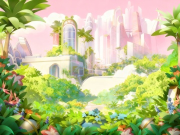 清新插画风,虚拟自然景观,舒适小屋点缀,营造宁静夏日氛围。