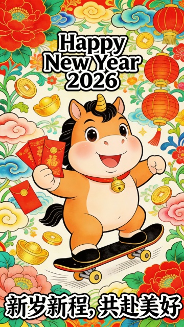 国潮风插画,拟人化萌马踩滑板送红包,融合传统花卉与灯笼元素,卡通可爱,喜庆印刷感十足,贺2026新春。