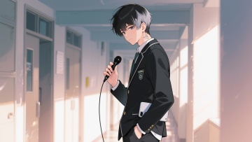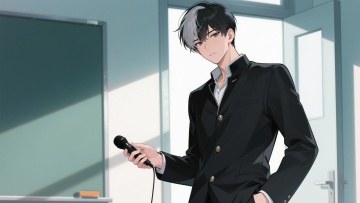 日式动漫风格 反转角色:江辰(叛逆校草・神秘盟友) 帮忙生成三张图,分别为正视图、侧视图、背面图三张 标签强化:叛逆不羁感 + 神秘可靠感,标志性道具(黑色录音笔)突出 三视图描述词: 正面:17 岁高中男生,短发(黑色带挑染银灰),剑眉星目,眼神锐利,校服纽扣解开两颗(带叛逆感),左手插兜,右手握着黑色录音笔(标志性道具),嘴角带冷笑,背景是教室门口(光线斜射),线条硬朗,叛逆气质,细节突出录音笔 侧面:侧脸轮廓分明,短发利落,录音笔握在右手(贴近身侧),校服肩线宽松,步伐带闯入感,背景虚化教室门,光影对比强烈,比例协调,神秘氛围 背面:短发直立带挑染,校服后颈有小纹身(低调叛逆),左手插兜(露出半截手机),右手握着录音笔(垂在身侧),背景是走廊(带阳光斜射),叛逆校草,录音笔道具,神秘气质 专属出图关键词:叛逆校草,黑色录音笔,挑染短发,解开纽扣校服,教室门口,冷笑表情,少年