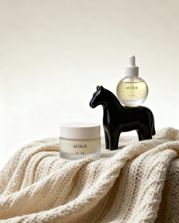 性冷淡风搭配轻拟物元素,柔软针织面料营造温馨舒适感,清透瓶身与哑光黑马雕塑呼应,传递柔和治愈的节日氛围。