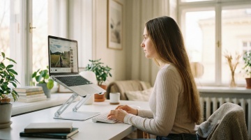 明亮的现代办公室环境,柔和的自然光透过大面积玻璃窗洒入室内,温暖的木质办公桌,桌上放着笔记本电脑、打开的笔记本、蓝色马克杯和一支铅笔,穿着米色开衫与白色衬衫的女性正在专注地使用笔记本电脑,背景有白色书写板、木质书架和简约办公家具,整体风格简约、专业、温馨,具有清晰的空间层次感和舒适的工作氛围,高清晰度,写实摄影风格,柔和光线,自然色彩。