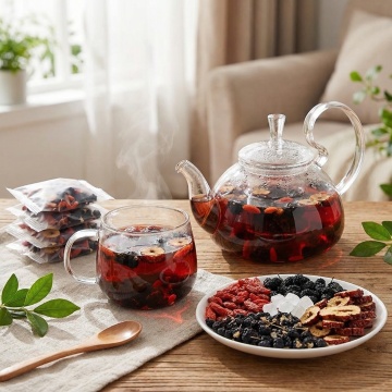 红金喜庆促销风设计,蜂蜜梅梅零食与松枝茶具结合,营造热闹年货节氛围