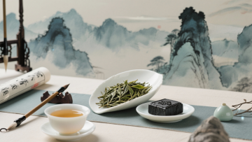 水墨山水屏风映衬青瓷茶杯,木雕托盘与干茶叶点缀,静谧质朴中透出古典中式韵味,实景质感十足。