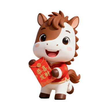 软3D风格萌马拟人化设计,身穿国潮红衣手持红包,喜庆可爱,节日氛围浓厚。
