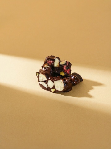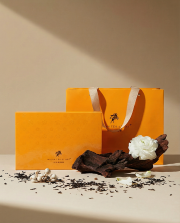 产品放在深棕色木桌上的一块石头上,桌面散落着桂花花瓣,高级红色调背景,斑驳的光影,新中式风格摄影,东方韵味,景深