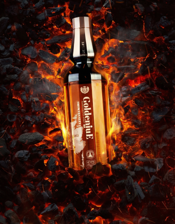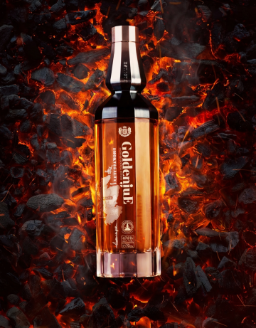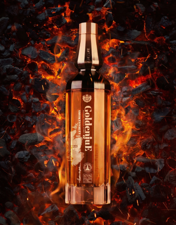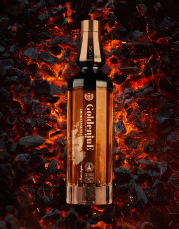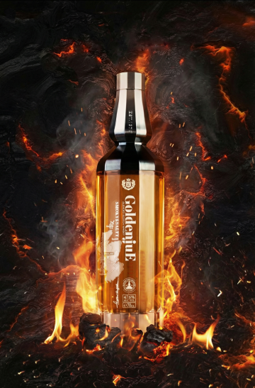 一瓶高品质的威士忌,瓶身呈深琥珀色,带有精致的雕花设计,金色螺旋瓶盖,瓶身正面贴有复古风格的白色标签,标签上有黑色的品牌名称和金色的装饰边框,整体置于纯白色背景上,光线从斜上方照射,瓶身表面有细腻的光影反射,展现出优雅奢华的质感。