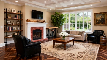 美式复古风客厅,融合古典感与温馨氛围,重拟物设计搭配油画风装饰,木雕质感家具与暖色调灯光营造优雅文艺的舒适空间。