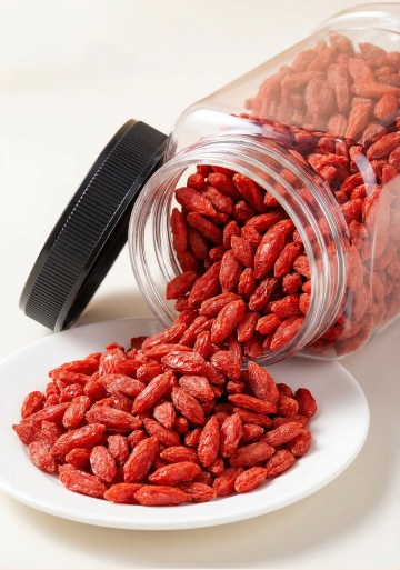 特写镜头下,新鲜饱满的枸杞果实,深红色的果实在柔和的自然光线下呈现出细腻的纹理和光泽,部分枸杞散落在古朴的木质托盘上,木质托盘边缘有自然的木纹和轻微的磨损痕迹,背景为模糊的暖色调木质元素和深色布料,营造出温馨自然的氛围,枸杞果实颗粒饱满,形态完整,表面光滑,光影效果柔和,突出枸杞的质感和新鲜感,整体画面构图平衡,色彩和谐,具有浓厚的自然健康风格。